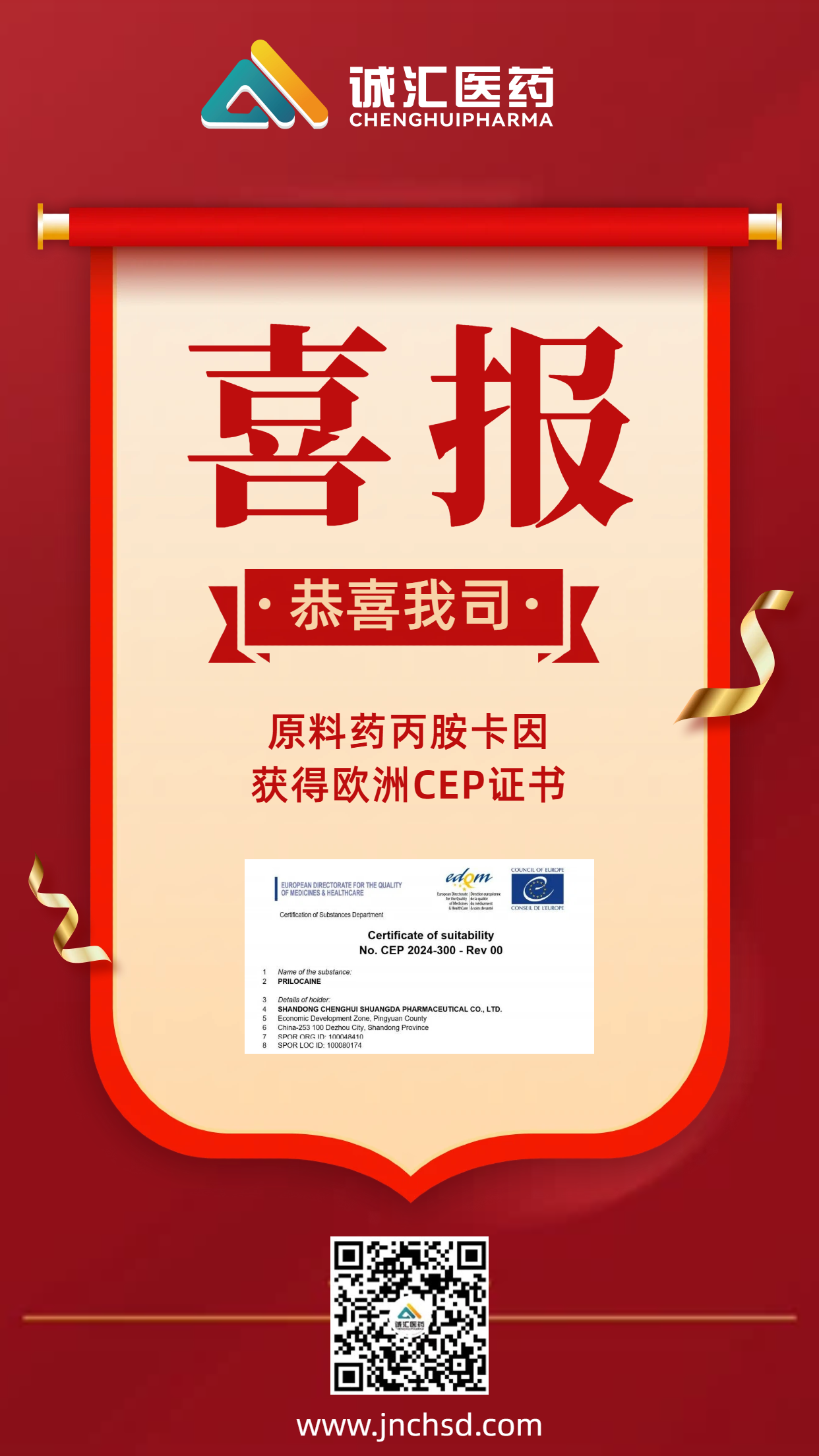 2025年12月19日,我公司原料药丙胺卡因欧洲CEP注册获批,并已收到欧洲药品质量管理局(EDQM)颁发的欧洲药典适用性证书(CEP证书)。